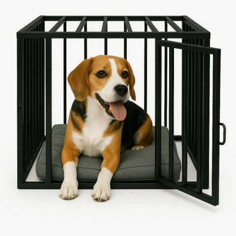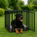 Solidna klatka z profili stalowych, zaprojektowana z myślą o bezpieczeństwie i komforcie psa – do domu, na taras i do samochodu.