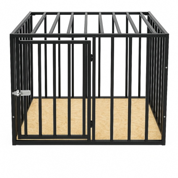Konstrukcja z profili stalowych daje dużo większą sztywność niż klasyczne klatki z drutu. Płyta OSB na spodzie tworzy stabilną bazę – wystarczy położyć na niej legowisko, materac lub grubszą matę, aby zapewnić psu wysoki komfort.