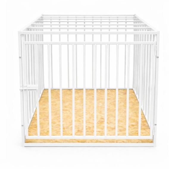 Konstrukcja wykonana jest z profili stalowych, co zapewnia dużo większą sztywność niż typowe klatki z cienkiego drutu. Płyta OSB na spodzie tworzy stabilną bazę – wystarczy położyć na niej legowisko, matę lub koc, aby stworzyć komfortowe miejsce wypoczynku dla psa.